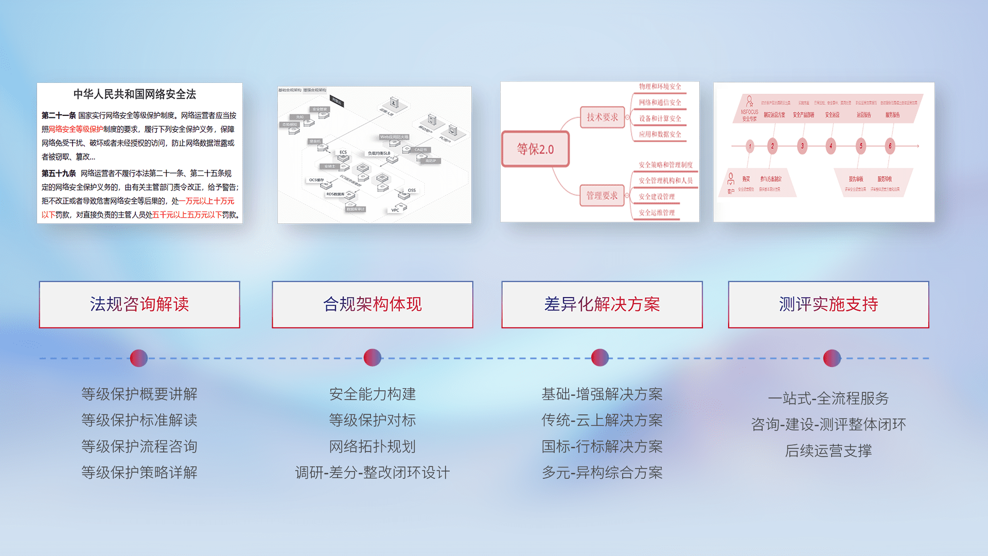 通过专业的法律咨询解读、、合规架构体现、、、差异化解决方案、、、、测试实施支持等服务,,,,为客户量身打造等保合规体系。。